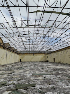 Em todo o complexo, o único edifício que mantém cobertura (o dos balneários aparenta ter sido demolido e os restantes edifícios tinham teto em madeira e arderam) é o que deverá ter sido a casa das máquinas: